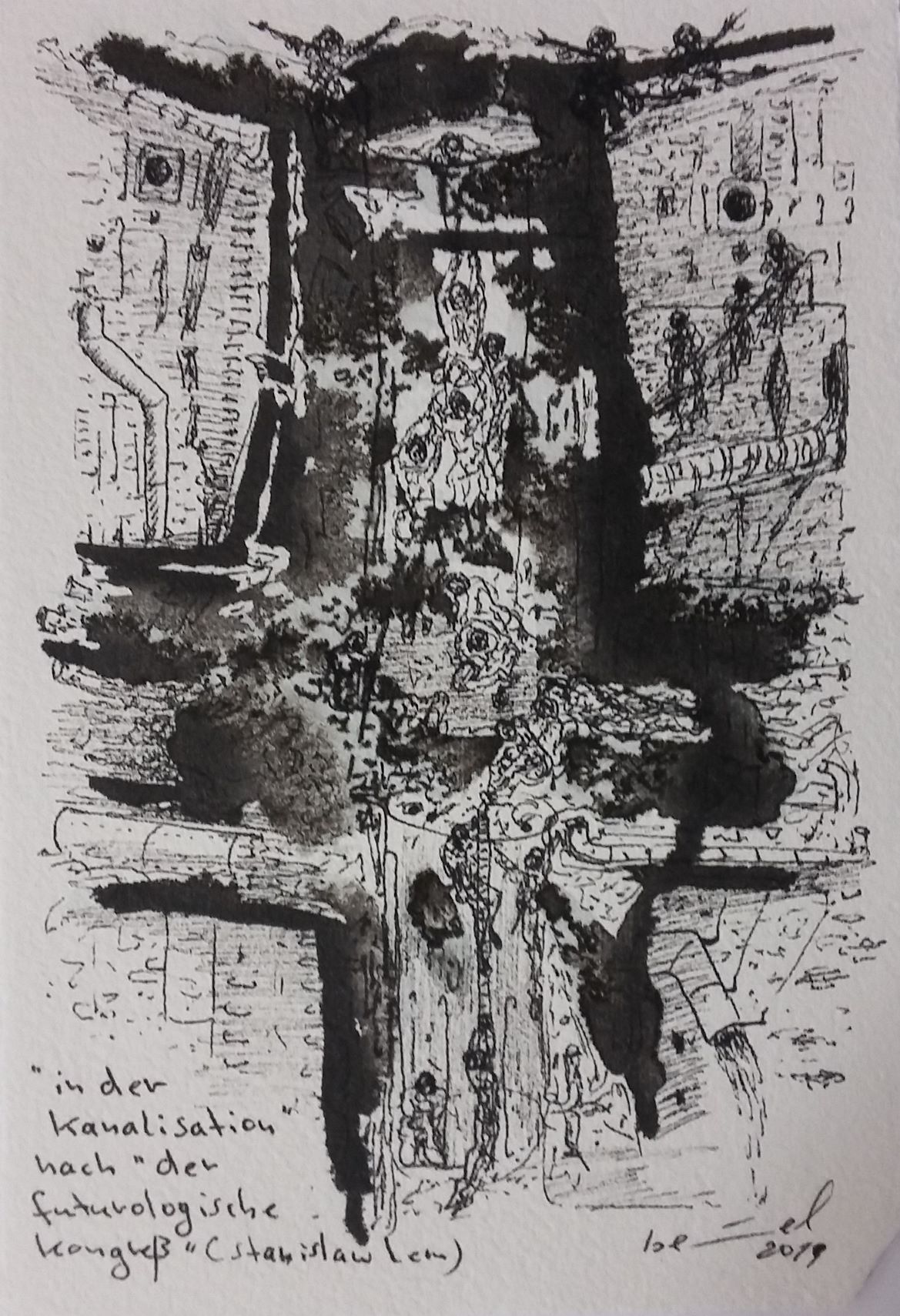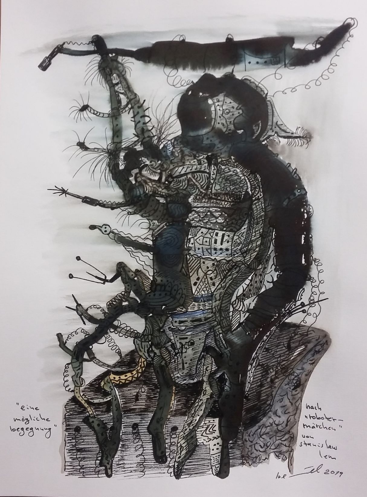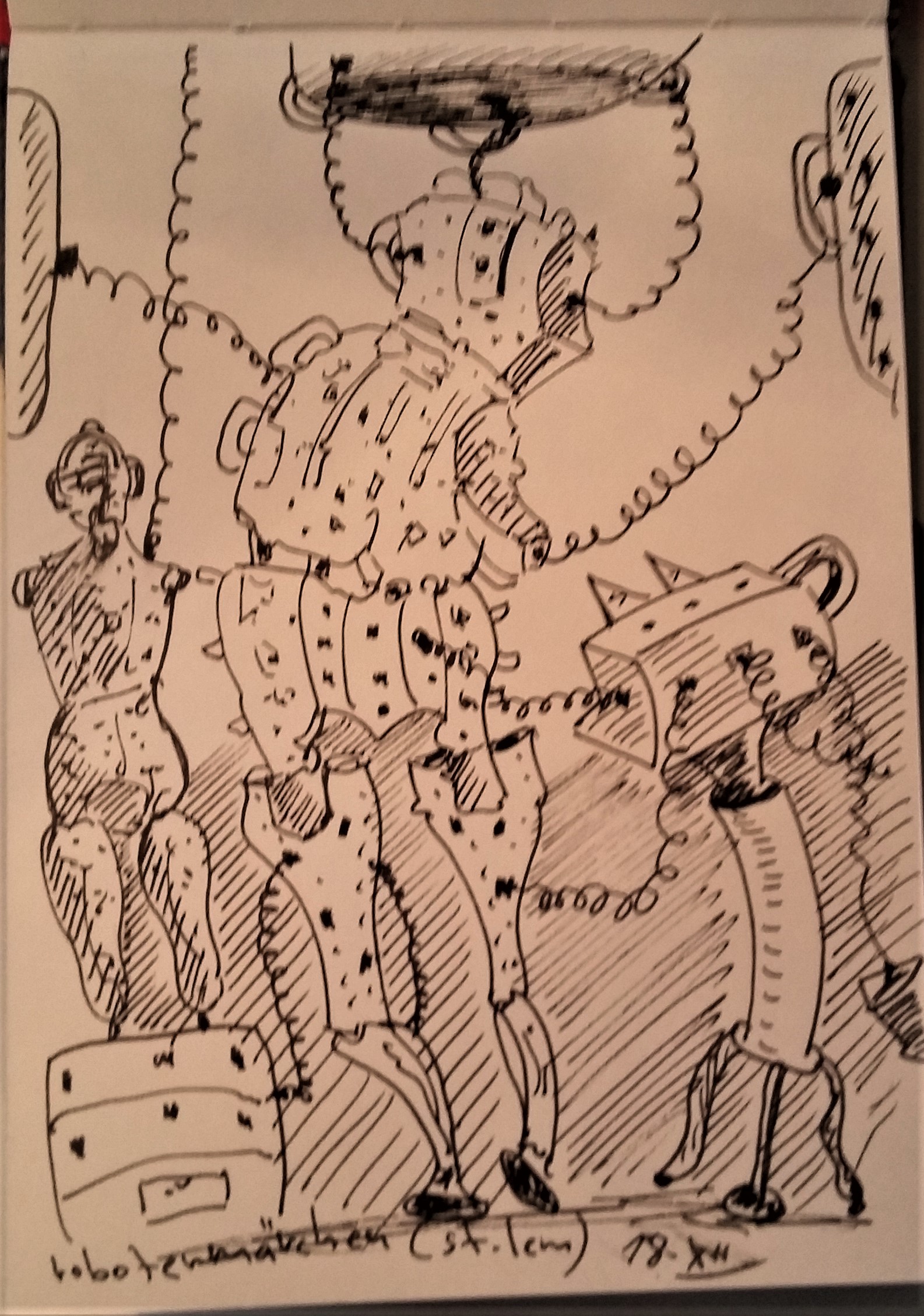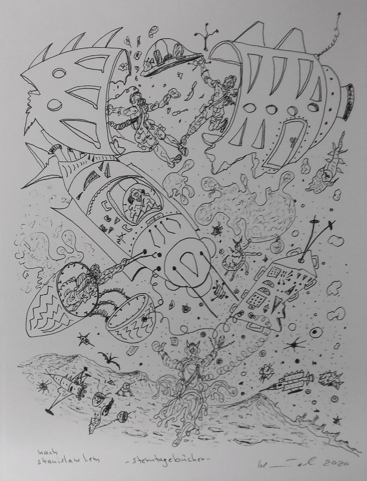 eine auswahl illustrationen (skizzen, zeichnungen, mischtechniken, malerei, druckgraphik, objekte) nach: "robotermärchen", "sterntagebücher", "solaris", "fiasko", "futurologischer kongress", u.a.m.